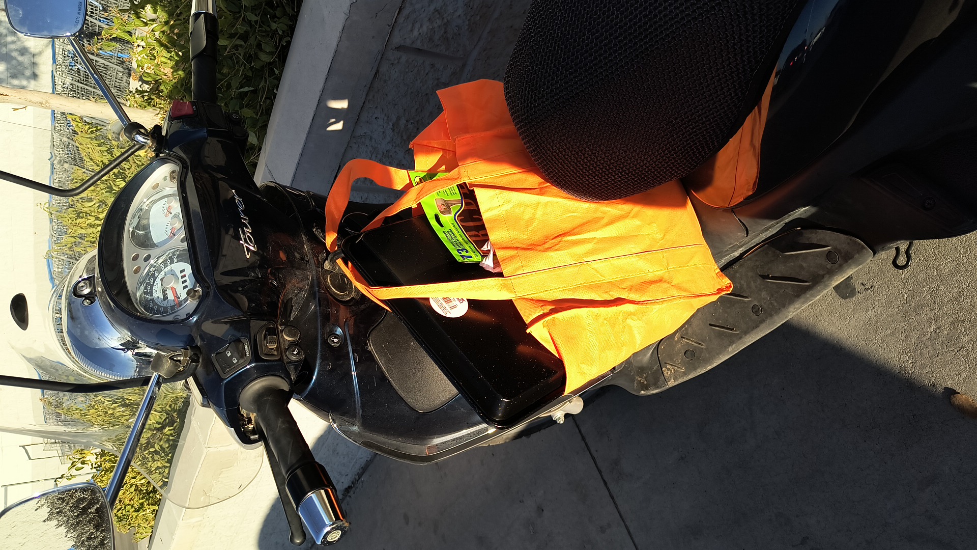 I use a carry basket in the store; a filled basket of food fits just right in the scooter’s top box. If I have excess or a strangely-shaped object I carry it on the floorboard supported by the bag hook.
